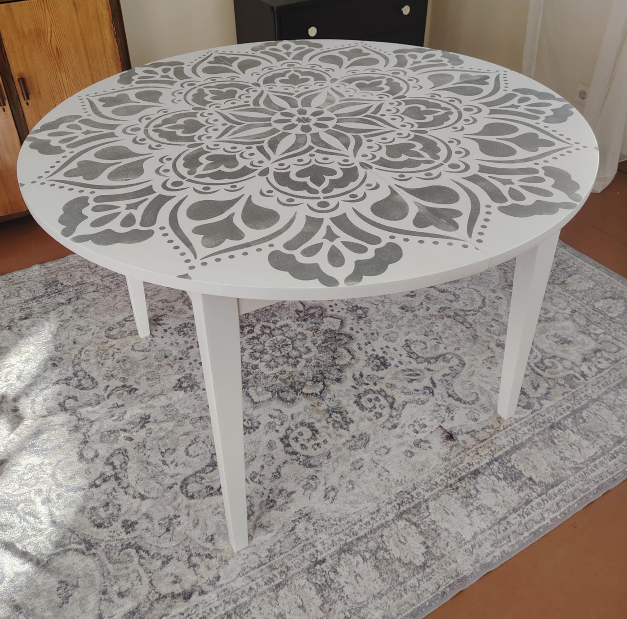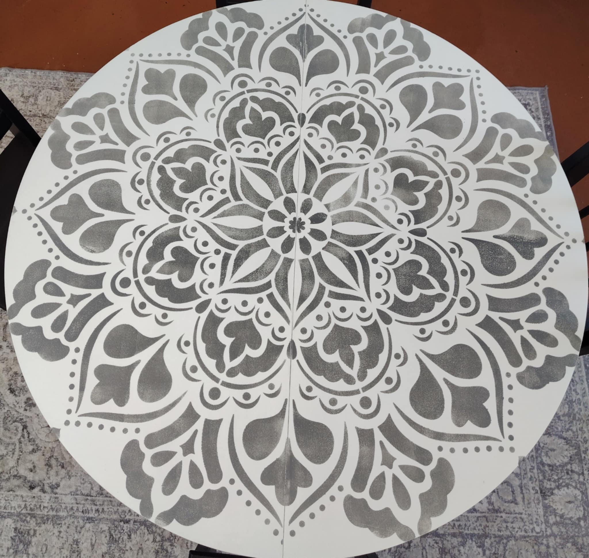 Ümar laud, mille keskle on pitsiline dekoratiivne muster hallikat tooni.