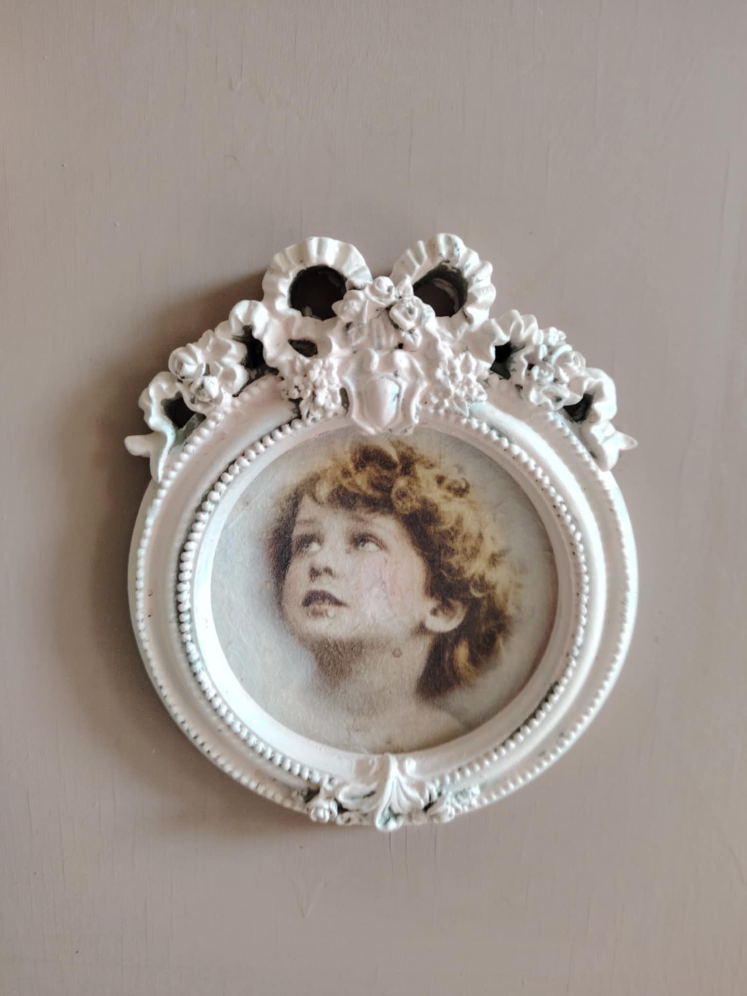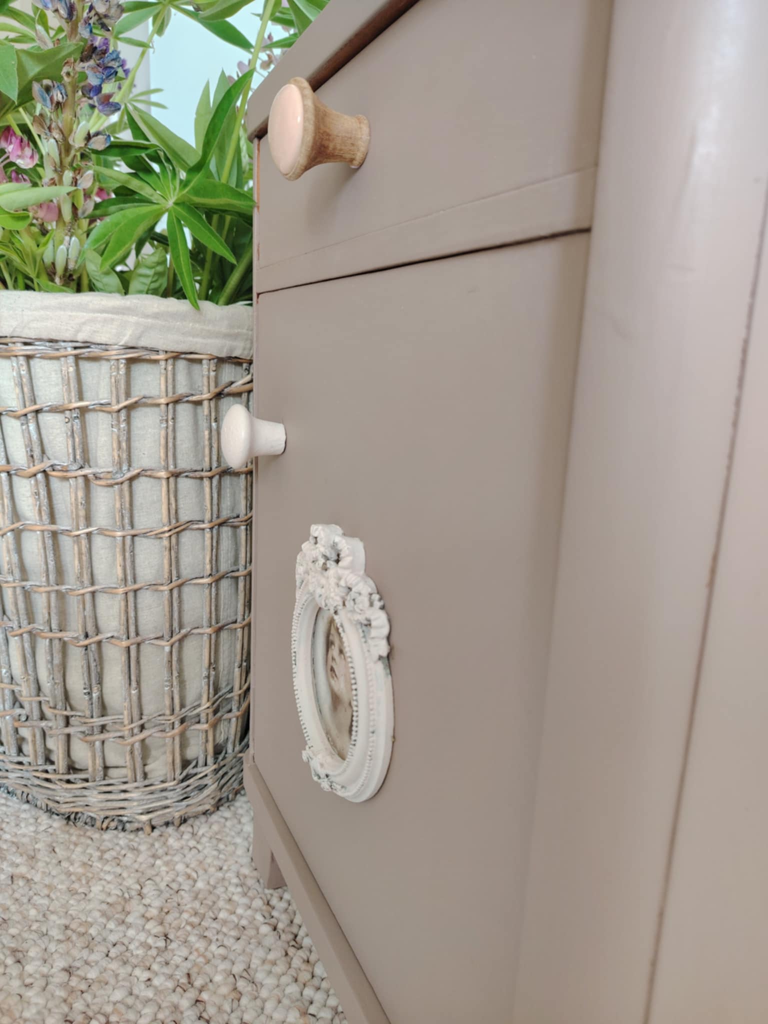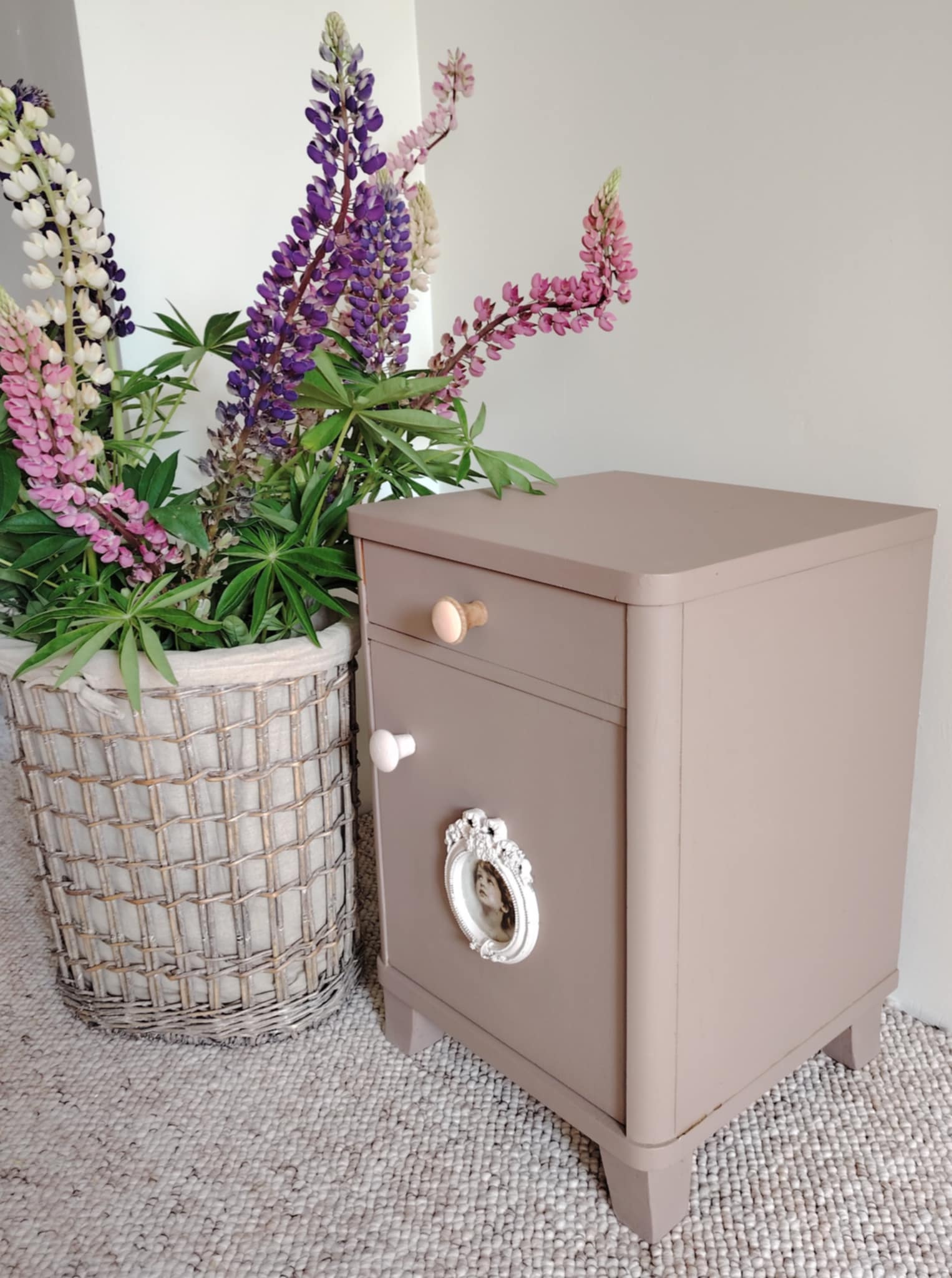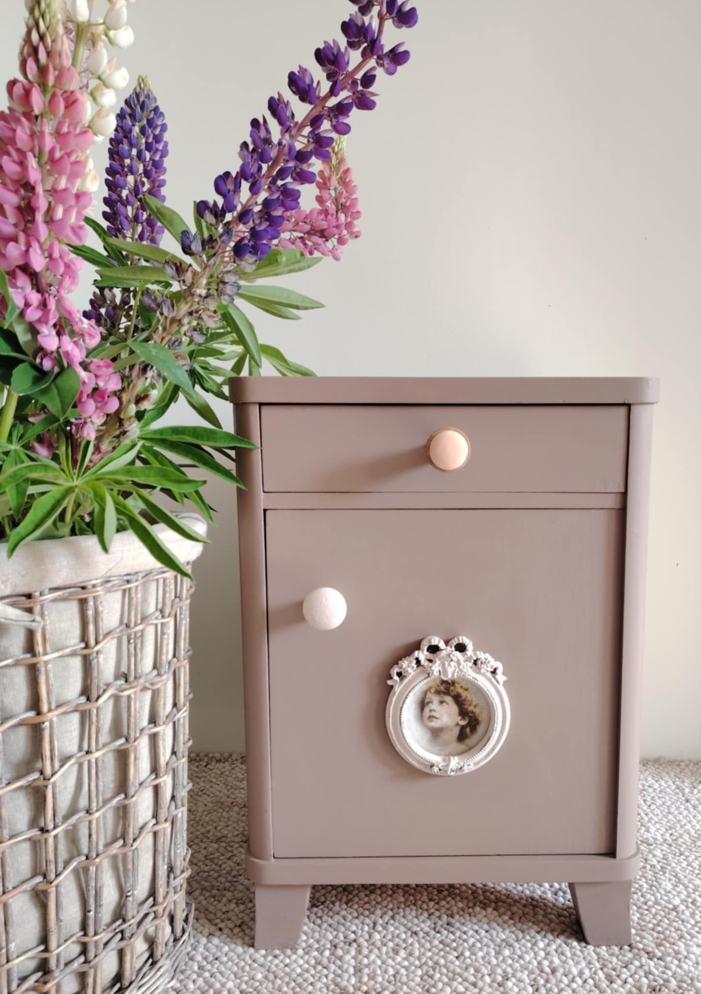 See armas ja õrna moega öökapp või abilaud on saanud täiesti uue elu. See tolumu  pruunikas toon  loob rahuliku ja hubase meeleolu, samas kui kaks erinevat nuppu ja romantiline miniatuurneportree annavad kapile omanäolise karakteri.